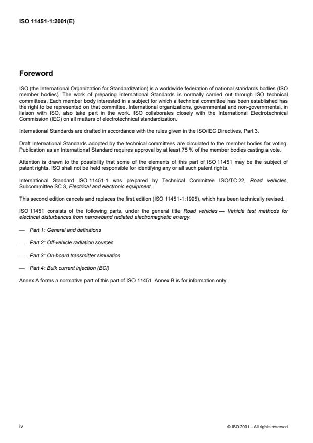 ISO 11451-1:2001 - Road vehicles -- Vehicle test methods for electrical disturbances from narrowband radiated electromagnetic energy
