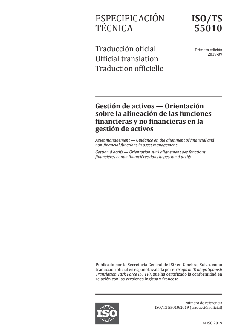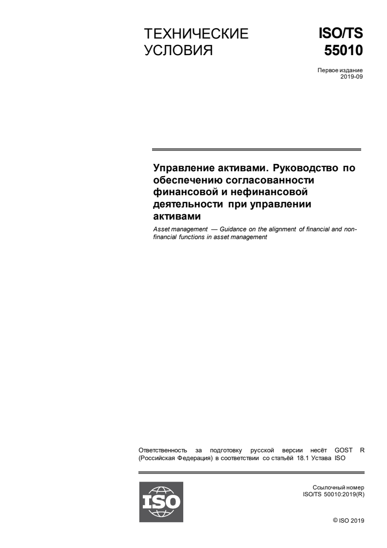 ISO/TS 55010:2019 - Asset management -- Guidance on the alignment of financial and non-financial functions in asset management