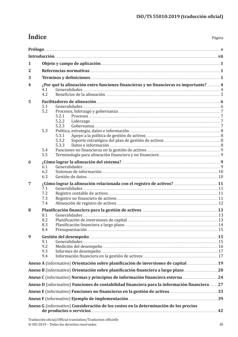 ISO/TS 55010:2019 is a technical specification published by the International Organization for Standardization (ISO). Its full title is "Asset management — Guidance on the alignment of financial and non-financial functions in asset management". This standard covers: This document gives guidelines for the alignment between financial and non-financial asset management functions, in order to improve internal control as part of an organization's management system. Alignment of these functions will enable the realization of value derived from the implementation of asset management detailed within ISO 55000, ISO 55001 and ISO 55002, particularly ISO 55002:2018, Annex F. The guidance in this document is consistent with the requirements of ISO 55001 for an asset management system but does not add new requirements to ISO 55001 or provide interpretations of the requirements of ISO 55001. For an example of an organization aligning its asset management functions, see Annex F.