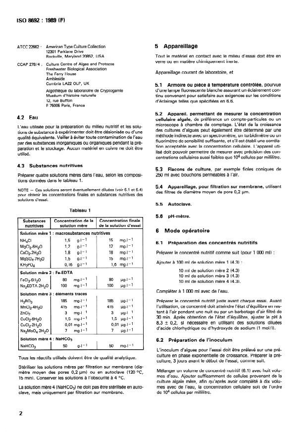 ISO 8692:1989 - Qualité de l'eau -- Essai d'inhibition de la croissance des algues d'eau douce avec Scenedesmus subspicatus et Selenastrum capricornutum