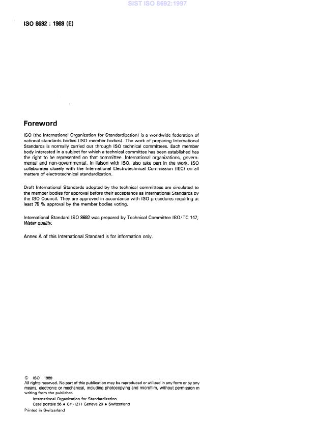 ISO 8692:1989 is classified under the following ICS (International Classification for Standards) categories: 13.060.70 - Examination of biological properties of water. The ICS classification helps identify the subject area and facilitates finding related standards.