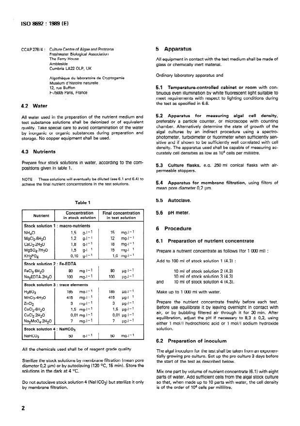 ISO 8692:1989 - Water quality -- Fresh water algal growth inhibition test with Scenedesmus subspicatus and Selenastrum capricornutum