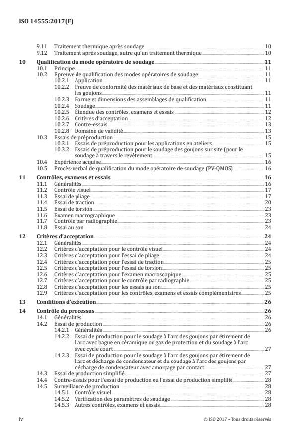 ISO 14555:2017 couvre le soudage à l'arc des goujons en matériau métallique soumis à des chargements statiques et de fatigue. Elle spécifie les exigences particulières au soudage des goujons qui se rapportent aux connaissances en soudage, aux exigences de qualité, au descriptif de mode opératoire de soudage, à la qualification du descriptif de mode opératoire de soudage, aux épreuves de qualification des opérateurs et au contrôle des soudures de production. ISO 14555:2017 est approprié lorsqu'il est exigé de démontrer la capacité d'un fabricant à produire des fabrications soudées possédant une qualité spécifiée. NOTE Les exigences générales de qualité pour le soudage par fusion des matériaux métalliques sont données dans l?ISO 3834‑1, l?ISO 3834‑2, l?ISO 3834‑3, l?ISO 3834‑4 et l?ISO 3834‑5. ISO 14555:2017 a été préparé dans un esprit d'exhaustivité pour lui permettre d'être utilisé comme référence dans les contrats. Les exigences qui sont données peuvent être adoptées en intégralité ou bien certaines d'entre elles peuvent être supprimées si elles ne sont pas pertinentes par rapport à la construction concernée (voir Annexe B). Pour la mise en ?uvre du soudage des goujons, voir Annexe A