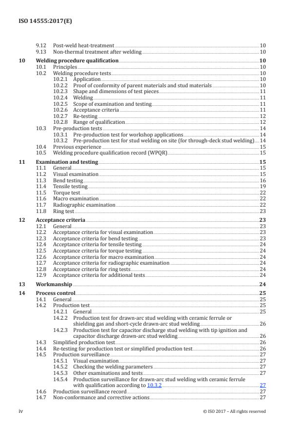 ISO 14555:2017 is a standard published by the International Organization for Standardization (ISO). Its full title is "Welding — Arc stud welding of metallic materials". This standard covers: ISO 14555:2017 covers arc stud welding of metallic materials subject to static and fatigue loading. It specifies requirements that are particular to stud welding, in relation to welding knowledge, quality requirements, welding procedure specification, welding procedure qualification, qualification testing of operators and testing of production welds. ISO 14555:2017 is appropriate where it is necessary to demonstrate the capability of a manufacturer to produce welded construction of a specified quality. NOTE General quality requirements for fusion welding of metallic materials are given in ISO 3834‑1, ISO 3834‑2, ISO 3834‑3, ISO 3834‑4 and ISO 3834‑5. ISO 14555:2017 has been prepared in a comprehensive manner, with a view to it being used as a reference in contracts. The requirements contained within it can be adopted in full, or partially, if certain requirements are not relevant to a particular construction (see Annex B). For processing of stud welding, see Annex A.