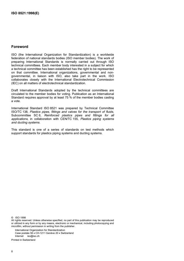 ISO 8521:1998 is a standard published by the International Organization for Standardization (ISO). Its full title is "Plastics piping systems — Glass-reinforced thermosetting plastics (GRP) pipes — Determination of the apparent initial circumferential tensile strength". This standard covers: Plastics piping systems — Glass-reinforced thermosetting plastics (GRP) pipes — Determination of the apparent initial circumferential tensile strength