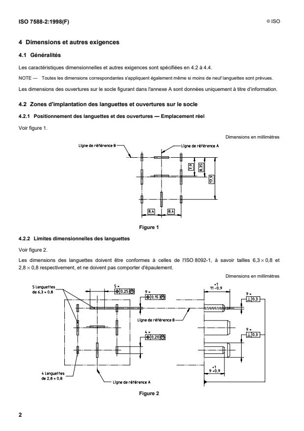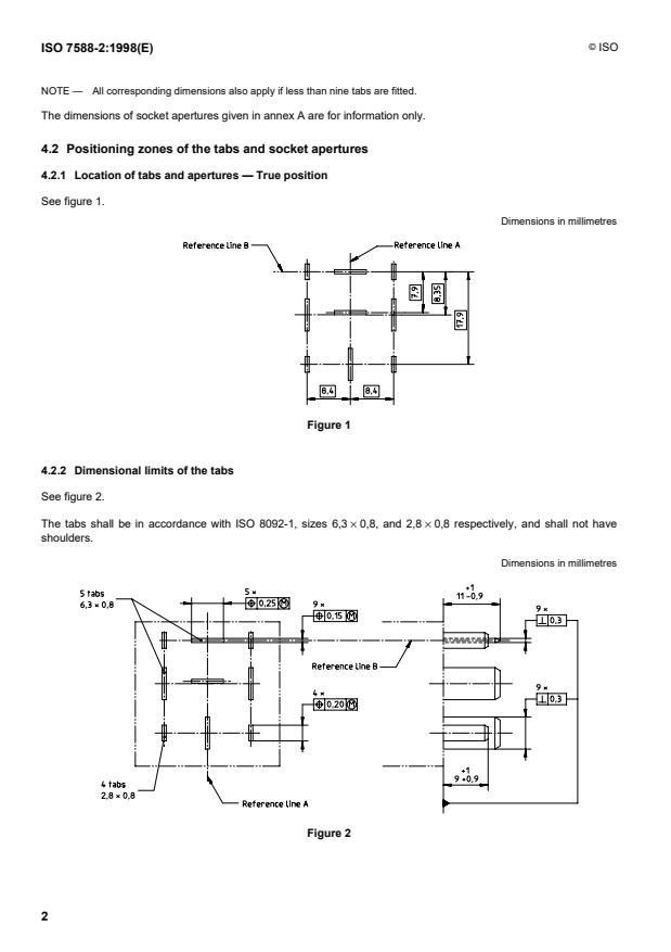 ISO 7588-2 details the required sizes and positioning of electronic device components such as tabs and socket apertures. It defines exact measurements for tab sizes (e.g., 6.3 × 0.8 mm, 2.8 × 0.8 mm) and allowable overall device dimensions to ensure uniformity.Socket Aperture Dimensions