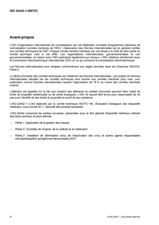ISO 22442-1:2007 applies to medical devices other than in vitro diagnostic medical devices manufactured utilizing materials of animal origin, which are non-viable or have been rendered non-viable. It specifies, in conjunction with ISO 14971, a procedure to identify the hazards and hazardous situations associated with such devices, to estimate and evaluate the resulting risks, to control these risks, and to monitor the effectiveness of that control. Furthermore, it outlines the decision process for the residual risk acceptability, taking into account the balance of residual risk, as defined in ISO 14971, and expected medical benefit as compared to available alternatives. ISO 22442-1:2007 is intended to provide requirements and guidance on risk management related to the hazards typical of medical devices manufactured utilizing animal tissues or derivatives such as: contamination by bacteria, moulds or yeasts; contamination by viruses; contamination by agents causing Transmissible Spongiform Encephalopathies (TSE); material responsible for undesired pyrogenic, immunological or toxicological reactions.