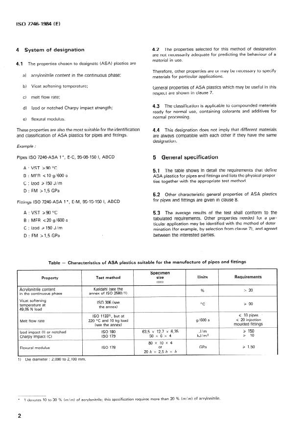 Specification of ASA plastics; for pipe applications the properties chosen to designate ASA-plastics are: acrylonitrile content, Vicat softening temperature, melt flow rate, impact strength (Izod or Charpy), flexural modulus.