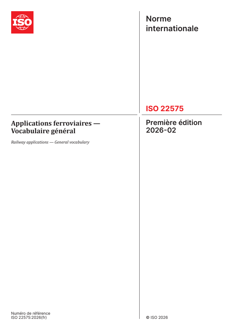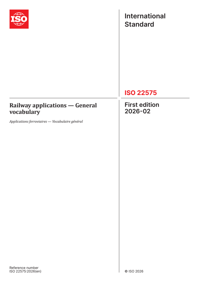 ISO 22575:2026 is a standard published by the International Organization for Standardization (ISO). Its full title is "Railway applications — General vocabulary". This standard covers: This document defines general terms and definitions for systems, products and services related to railway applications. This document does not cover terms and definitions related to electrotechnical and electronic products and services for railway applications.