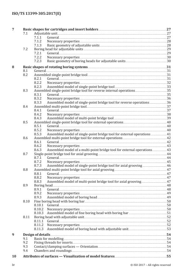 ISO/TS 13399-305:2017 specifies a concept for the design of tool items, for all kinds of modular tooling systems with adjustable cartridges for boring, together with the usage of the related properties and domains of values. ISO/TS 13399-305:2017 specifies a common way of designing simplified models that contain the following: - definitions and identifications of the design features of modular tooling systems with adjustable cartridges for boring, with an association to the used properties; - definitions and identifications of the internal structure of the 3D model that represents the features and the properties of modular tooling systems with adjustable cartridges for boring. The following are outside the scope of this document: a) applications where these standard data may be stored or referenced; b) concept of 3D models for cutting tools; c) concept of 3D models for cutting items; d) concept of 3D models for other tool items not being described in the scope of this document; e) concept of 3D models for adaptive items; f) concept of 3D models for assembly items and auxiliary items.