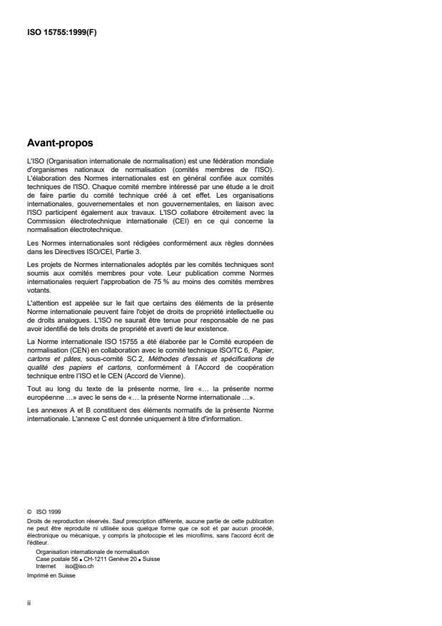 ISO 15755:1999 is a standard published by the International Organization for Standardization (ISO). Its full title is "Paper and board — Estimation of contraries". This standard covers: La présente norme internationale spécifie la méthode d'essai d'estimation sous lumière réfléchie des défauts visibles dans le papier. L'examen visuel est applicable à la plupart des sortes de papiers et cartons.Les papiers et cartons avec un taux de défauts apparemment élevé nécessitent d'être examinés au moyen de dispositifs automatiques comme décrit dans l'annexe B, car l'ennui provoqué par de grands dénombrements diminue la précision du jugement des observateurs.Cependant, les papiers qui ne sont pas plats, qui ont un faible facteur de réflectance lumineuse (valeur y inférieure à 30 %) et qui contiennent des trous peuvent causer des problèmes particuliers avec les dispositifs automatiques (voir annexe B). Les points fluorescents ne seront pas détectés par la méthode décrite dans la présente norme internationale.