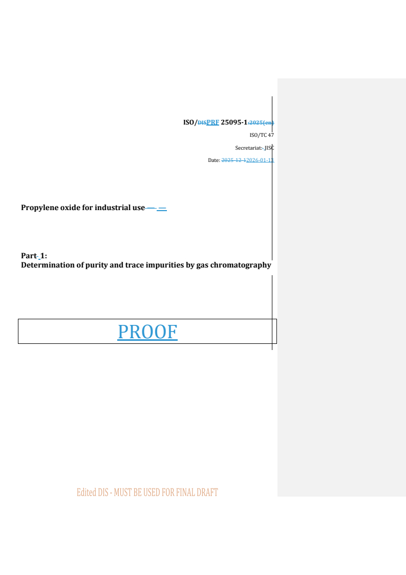 REDLINE ISO/PRF 25095-1 - Propylene oxide for industrial use — Part 1: Determination of purity and trace impurities by gas chromatography Released:15. 01. 2026