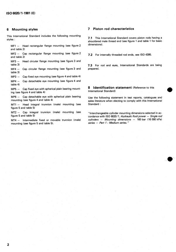 ISO 6020-1:1981 is a standard published by the International Organization for Standardization (ISO). Its full title is "Hydraulic fluid power — Single rod cylinders — Mounting dimensions — 160 bar (16 000 kPa) series — Part 1: Medium series". This standard covers: Hydraulic fluid power — Single rod cylinders — Mounting dimensions — 160 bar (16 000 kPa) series — Part 1: Medium series