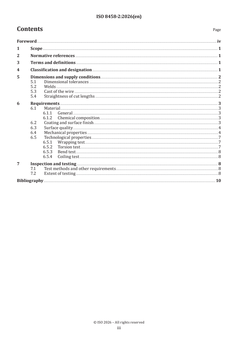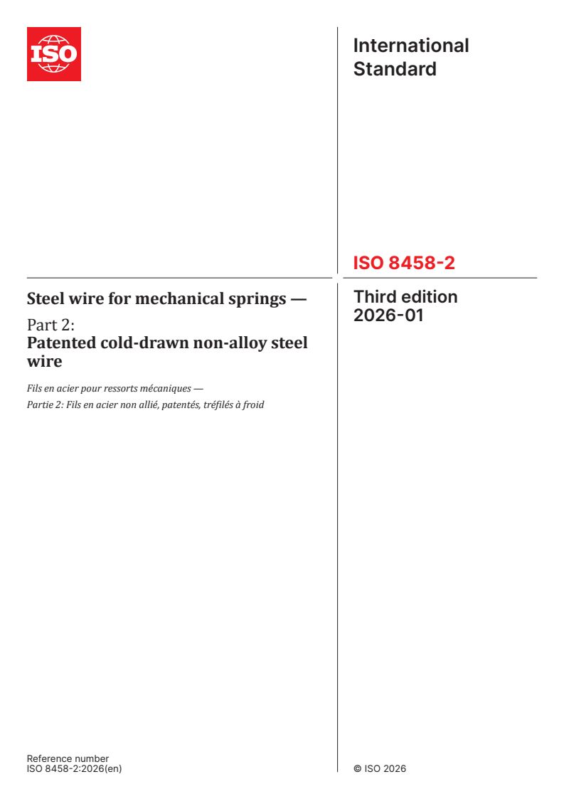 ISO 8458-2:2026 is a standard published by the International Organization for Standardization (ISO). Its full title is "Steel wire for mechanical springs — Part 2: Patented cold-drawn non-alloy steel wire". This standard covers: This document specifies requirements for cold-drawn non-alloy steel wire for the manufacture of mechanical springs for static duty and dynamic duty applications, in accordance with the general requirements of ISO 8458-1.