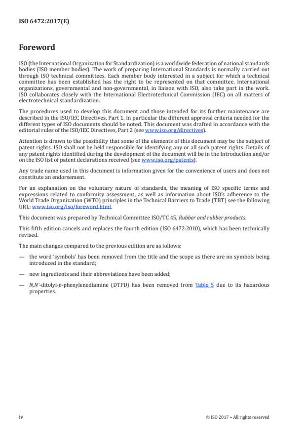 ISO 6472:2017 is a standard published by the International Organization for Standardization (ISO). Its full title is "Rubber compounding ingredients — Abbreviated terms". This standard covers: ISO 6472:2017 establishes unambiguous abbreviated terms for commonly used rubber compounding ingredients of known, specific chemical composition.