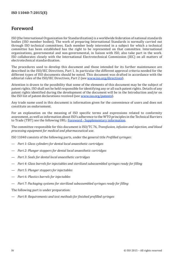 ISO 11040-7:2015 is a standard published by the International Organization for Standardization (ISO). Its full title is "Prefilled syringes — Part 7: Packaging systems for sterilized subassembled syringes ready for filling". This standard covers: ISO 11040-7:2015 specifies the packaging system that is used to deliver sterilized subassembled syringes ready for filling in tubs and nests. Downstream processes (processes after filling such as in house/outside transport, reprocessing) can result in specific requirements on the packaging system used to deliver sterilized subassembled syringes ready for filling. However, these requirements are not within the scope of ISO 11040-7:2015.