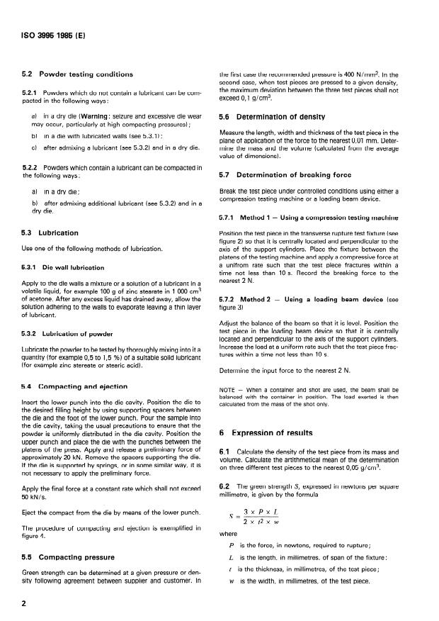 This second edition cancels and replaces the first edition (i. e. ISO 3995:1977). The method subjects a compact pressed form metallic powder to a uniformly increasing transverse force under controlled conditions until fracture occurs. the green strength is determined on compacts either having a particular density or after compaction at a specific compacting pressure.