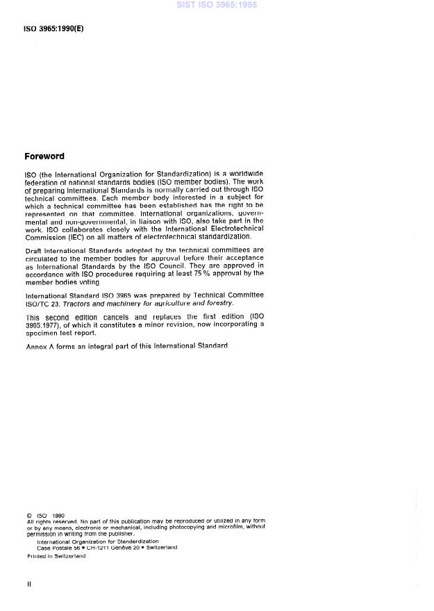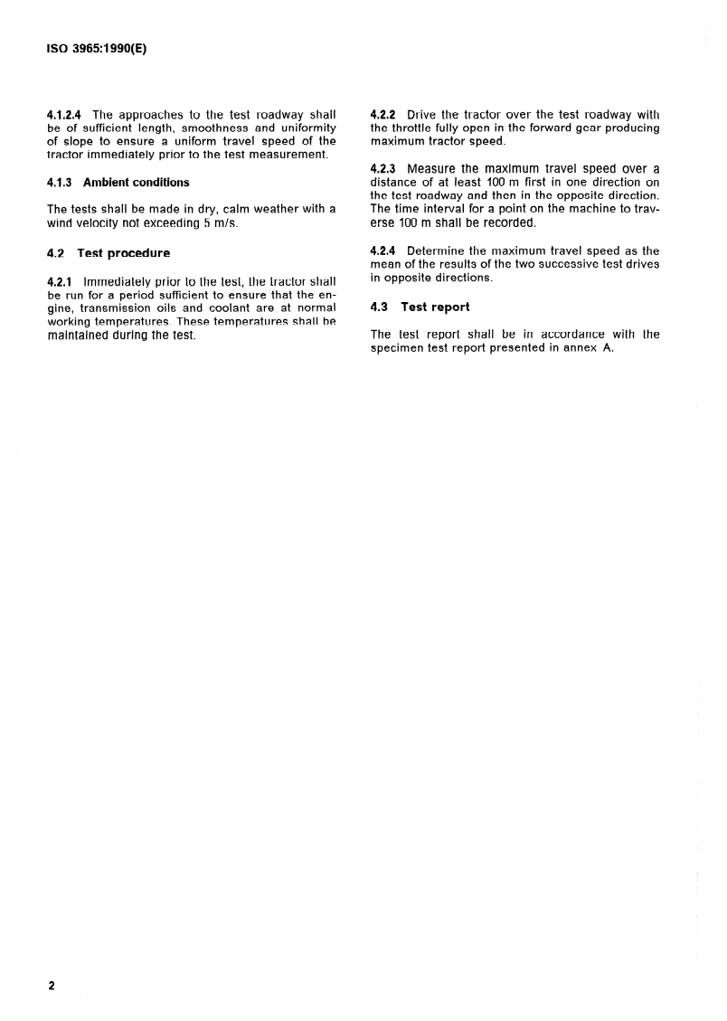 ISO 3965:1990 is an international standard published by the International Organization for Standardization (ISO) that specifies methods for determining the maximum speeds of agricultural wheeled tractors. This second edition replaces the initial 1977 version, providing updated procedural clarity and including a specimen test report in its normative annex. The standard outlines both a calculation method for maximum design speed and a practical measurement method for maximum travel speed on roads.