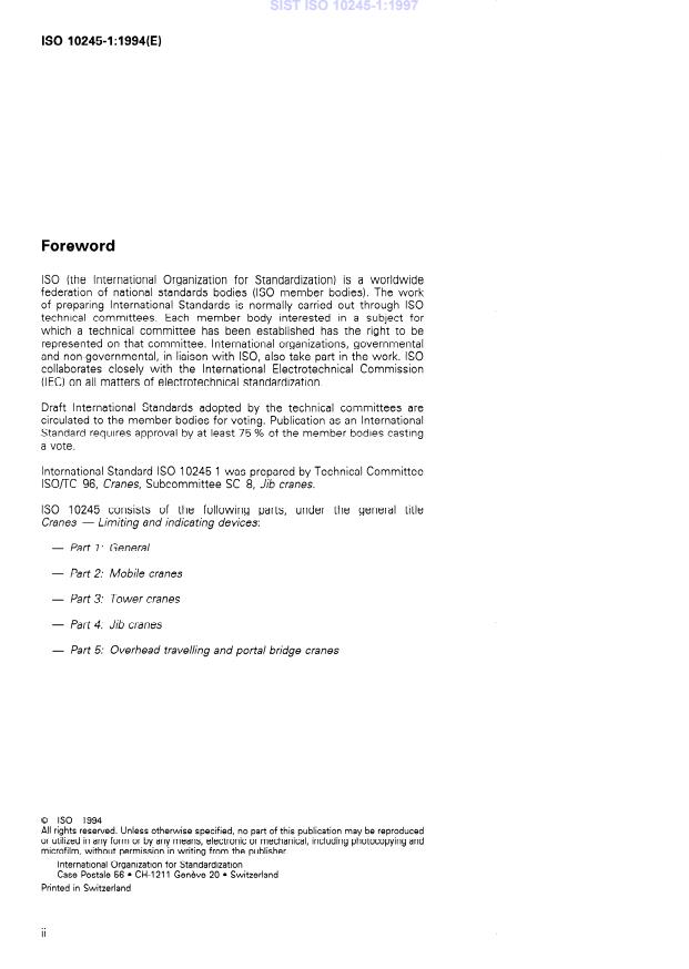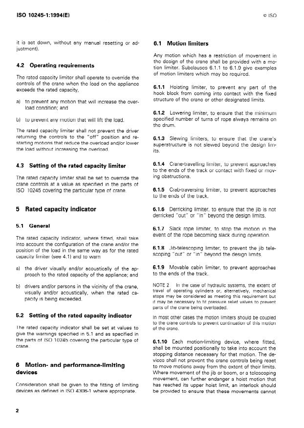 ISO 10245-1:1994 is a standard published by the International Organization for Standardization (ISO). Its full title is "Cranes — Limiting and indicating devices — Part 1: General". This standard covers: Specifies general requirements for limiting and indicating devices for lifting appliances that are applicable to loads and motions, performance and environment. These devices restrict operation and/or provide the driver or other persons with operational information.