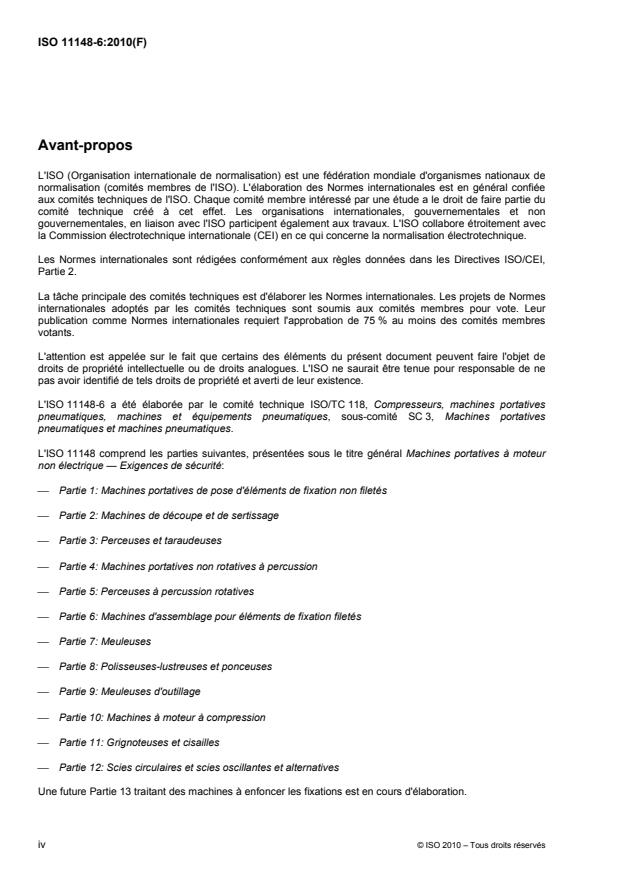 L'ISO 11148-6:2010 s'applique aux machines portatives non électriques (appelées dans le reste du texte «machine portative d'assemblage pour éléments de fixation filetés» ou «machine portative d'assemblage») utilisées pour le serrage ou la mise en place d'éléments de fixation filetés. Les machines portatives d'assemblage pour éléments de fixation filetés peuvent être alimentées par air comprimé, fluide hydraulique ou moteurs à combustion interne et sont prévues pour être utilisées par un opérateur ou portées par la ou les mains de l'opérateur avec ou sans suspension, par exemple à l'aide d'un équilibreur. L'ISO 11148-6:2010 couvre les clés à impulsion hydropneumatiques, les clés à choc, les machines pour mise en place d'éléments de fixation, les serreuses, les serreuses à renvoi d'axe avec une noix de serrage ouverte, les clés à rochet et les visseuses. L'ISO 11148-6:2010 ne couvre pas les exigences spécifiques et les modifications des machines portatives d'assemblage pour éléments de fixation filetés destinées à être montées sur un châssis. L'ISO 11148-6:2010 traite de tous les phénomènes dangereux, situations dangereuses ou événements dangereux significatifs, à l'exception des machines portatives d'assemblage pour éléments de fixation filetés destinées à être utilisées dans une atmosphère potentiellement explosible, lorsqu'elles sont utilisées normalement et lorsqu'elles font l'objet d'un mauvais usage raisonnablement prévisible par le fabricant.