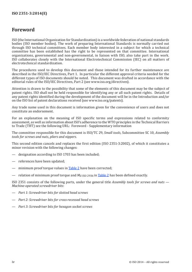 ISO 2351-3:2014 is a standard published by the International Organization for Standardization (ISO). Its full title is "Assembly tools for screws and nuts — Machine-operated screwdriver bits — Part 3: Screwdriver bits for hexagon socket screws". This standard covers: ISO 2351-3:2014 prescribes the technical specifications for machine-operated screwdriver bits for hexagon socket screws, listed in ISO 1703 under reference number 3 2 03 01 0. It applies to bits with male hexagon drive or with cylindrical flat-end drive as defined in ISO 1173 and to tips for screwdrivers as defined in ISO 2936. It also gives recommended combinations between tips and bits.
