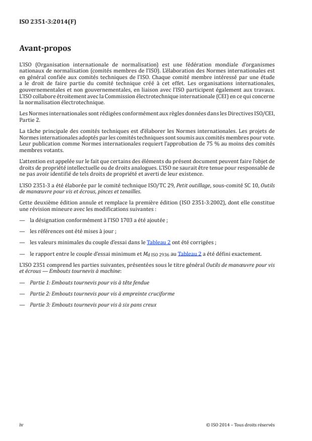 l'ISO 2351-3:2014 fixe les spécifications techniques des embouts tournevis à machine pour vis à six pans creux, cités dans l'ISO 1703 sous la référence 3 2 03 01 0. Elle s'applique aux embouts à hexagone conducteur mâle ou à queue cylindrique à méplat tels que définis dans l'ISO 1173, et pour des extrémités de tournevis telles que définies dans l'ISO 2936. Elle donne également les combinaisons recommandées entre les extrémités en contact avec la vis et les entraînements.