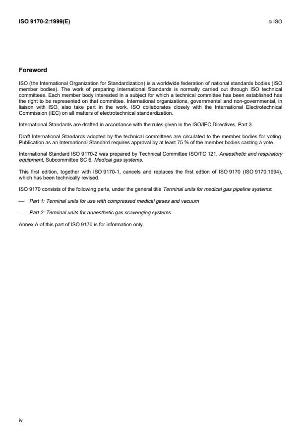 ISO 9170-2:1999 is a standard published by the International Organization for Standardization (ISO). Its full title is "Terminal units for medical gas pipeline systems — Part 2: Terminal units for anaesthetic gas scavenging systems". This standard covers: Terminal units for medical gas pipeline systems — Part 2: Terminal units for anaesthetic gas scavenging systems