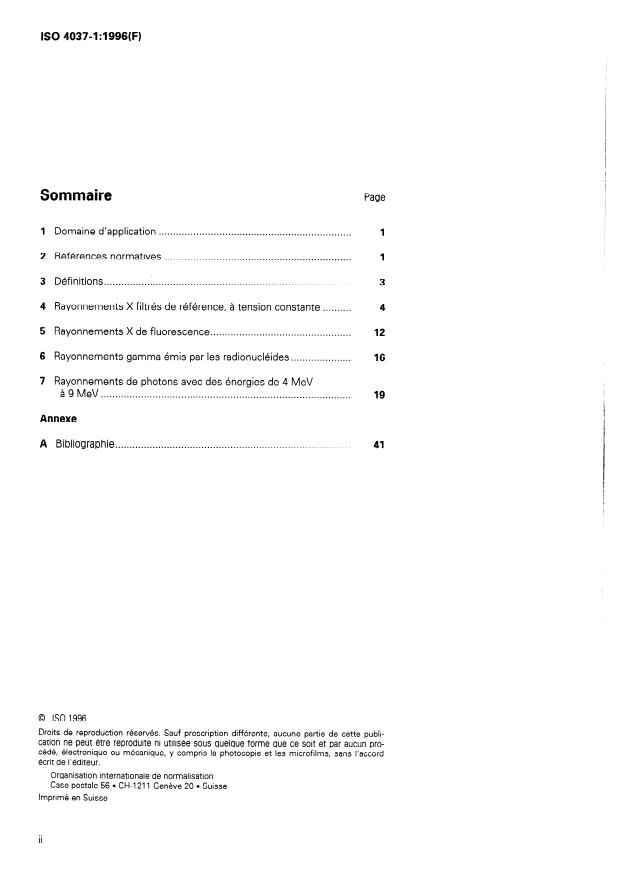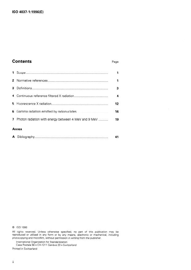 ISO 4037-1:1996 is a standard published by the International Organization for Standardization (ISO). Its full title is "X and gamma reference radiation for calibrating dosemeters and doserate meters and for determining their response as a function of photon energy — Part 1: Radiation characteristics and production methods". This standard covers: Specifies the characteristics and production methods of X and gamma reference radiation for calibrating dosemeters and rate dosemeters at air kerma rates from 10 Gy/h to 10 Gy/h and for determining their response as a function of photon energy.