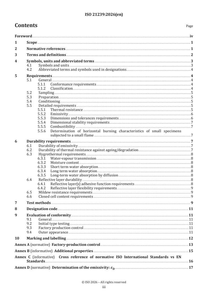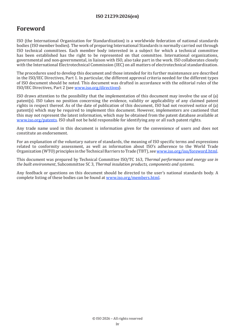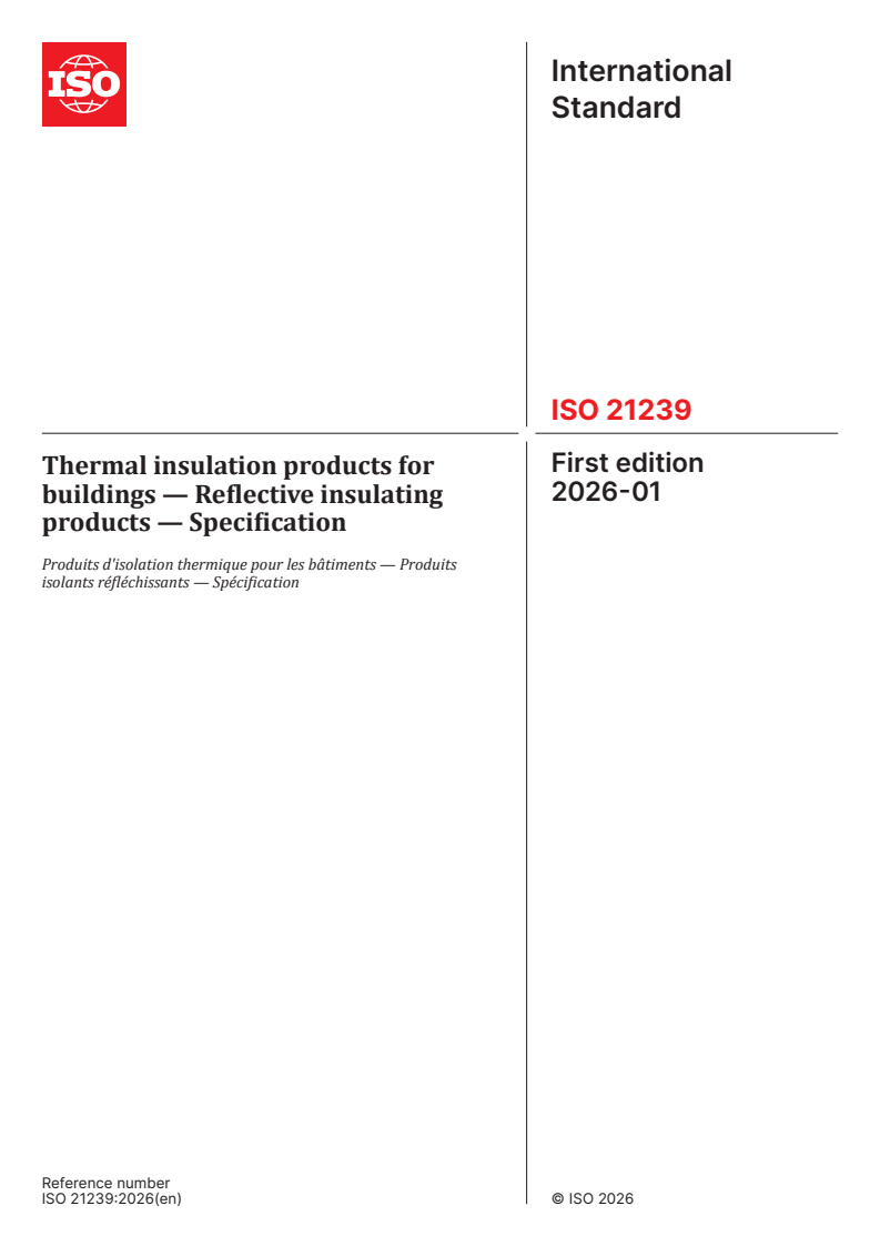ISO 21239:2026 is a standard published by the International Organization for Standardization (ISO). Its full title is "Thermal insulation products for buildings — Reflective insulating products — Specification". This standard covers: This document specifies the requirements for factory-made thermal insulating products containing one or more reflective or low-emissivity surface components, and designed to be used in conjunction with an incorporated air space, for the thermal insulation of buildings. This document specifies products manufactured in the form of rolls, boards and sheets, and also covers products that are used in prefabricated thermal insulation systems and composite panels. Such prefabricated systems and composite panels are not within the scope of this document. The products specified in this document are not intended for use in load-bearing applications. This document does not specify the required level of a given property to be achieved by a product to demonstrate fitness for purpose in an application. The levels of performance required for a given application are to be found in project specifications.