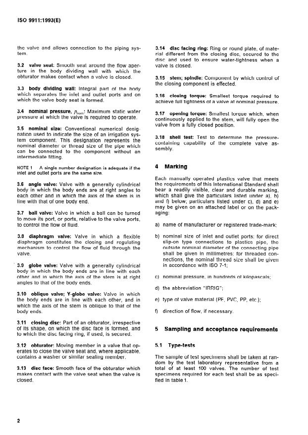 ISO 9911:1993 is a standard published by the International Organization for Standardization (ISO). Its full title is "Agricultural irrigation equipment — Manually operated small plastics valves". This standard covers: Specifies the general requirements and test methods. Applies to valves of nominal sizes up to and including 90 mm (3 in). The valves are intended for installation in irrigation piping networks, using water at temperatures up to 50 °C at nominal pressures as designated by the manufacturer.