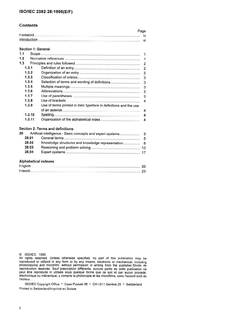ISO/IEC 2382-28:1995 is a standard published by the International Organization for Standardization (ISO). Its full title is "Information technology — Vocabulary — Part 28: Artificial intelligence — Basic concepts and expert systems". This standard covers: Defines basic concepts related to artificial intelligence and expert systems.