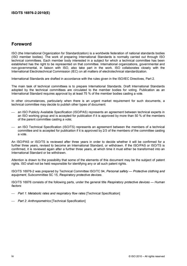 ISO/TS 16976-2:2010 is a technical specification published by the International Organization for Standardization (ISO). Its full title is "Respiratory protective devices — Human factors — Part 2: Anthropometrics". This standard covers: ISO/TS 16976‑2:2010 is one part of a series of technical specifications that provide information on factors related to human anthropometry, physiology, ergonomics and performance for the preparation of standards for design, testing and use of respiratory protective devices. ISO/TS 16976‑2:2010 contains information related to anthropometry. In particular, information is given for: anthropometric measurement methods; anthropometric data for head, face and neck dimensions; anthropometric data for torso dimensions; human test panels; models of headforms.