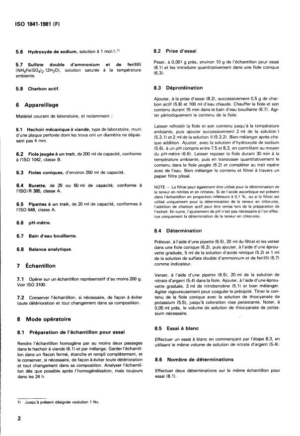 ISO 1841:1981 - Viandes et produits a base de viande -- Détermination de la teneur en chlorures (Méthode de référence)