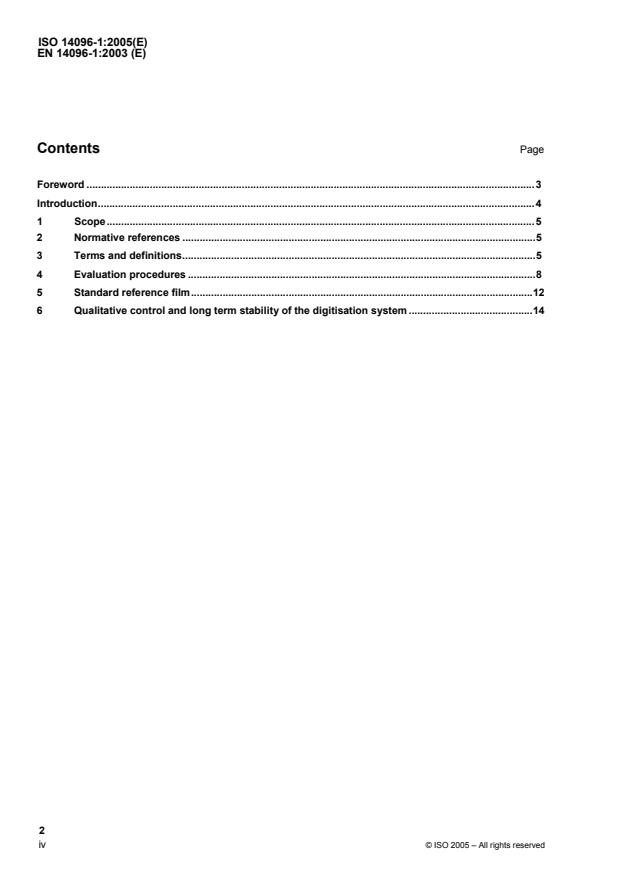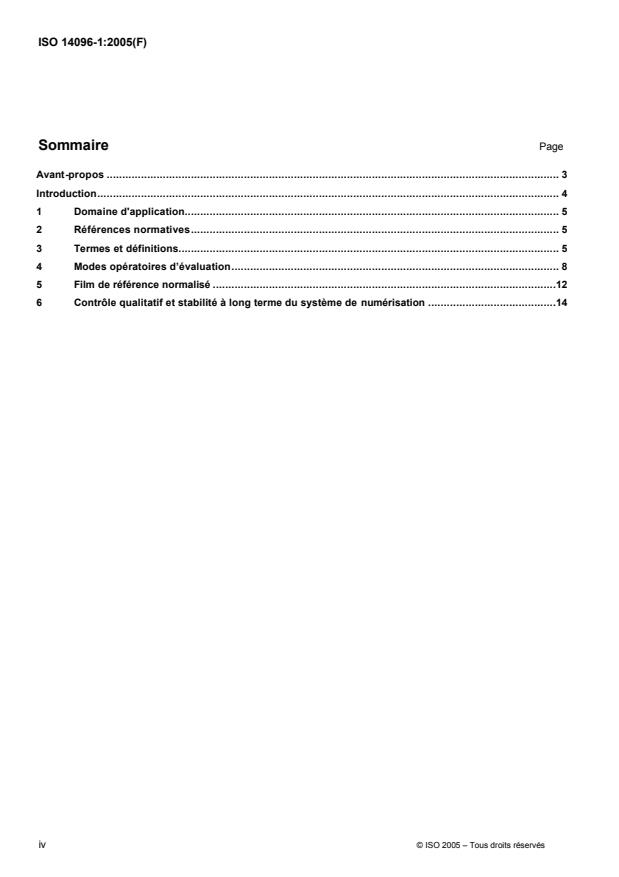 L'ISO 14096-1:2005 spécifie les procédures d'évaluation des paramètres de performance de base du processus de numérisation des films radiographiques tels que la résolution et la linéarité spatiales, la plage de densité, la sensibilité au contraste de densité et la courbe de transfert caractéristique. Ils peuvent être intégrés au logiciel du système ainsi qu'au film de référence normalisé utilisé pour le contrôle qualité du processus de numérisation. Ce film de référence comporte une série de cibles de contrôle pour l'évaluation de la performance. Ces cibles de contrôle permettent une évaluation du système de numérisation présentant une résolution spatiale allant jusqu'à 25 µm, une sensibilité au contraste de densité avec jusqu'à 0,02 de densité optique, une plage de densité comprise entre 0,5 et 4,5 et un format de film d'une capacité de (350 x 430) mm2 (14 x 17 pouces). L'ISO 14096-1:2005 ne s'adresse pas au traitement du signal et à l'affichage des données numérisées.