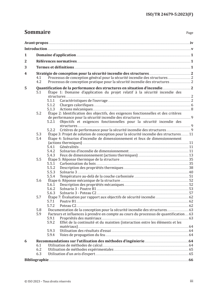 Le présent document développe une application de l’ingénierie de la sécurité incendie relative à l’évaluation de la résistance au feu d’un immeuble en bois de plusieurs étages conformément à la méthodologie donnée dans l’ISO 24679-1. Dans la volonté de faciliter la compréhension du processus de dimensionnement présenté ci-après, le présent document suit la même procédure par étapes que celle donnée dans l’ISO 24679-1. L’approche d’ingénierie de la sécurité incendie repose sur la résistance au feu d’un immeuble en bois de plusieurs étages et considère des scénarios d’incendie de dimensionnement spécifiques, lesquels impactent la résistance au feu des éléments structuraux. Dans l’exemple développé ci-après, il a été adopté, pour l’analyse de la tenue au feu, une approche au niveau du composant (analyse de l’élément). Une telle approche fournit généralement une conception plus prudente qu’une analyse (structurale globale) au niveau du système ou qu’une analyse des parties de la structure notamment lorsqu’une interaction entre les éléments peut être évaluée. L’approche au niveau du composant présente un avantage qui est que les calculs peuvent être effectués avec l’utilisation de modèles analytiques simples ou de tableurs. Une modélisation avancée utilisant la dynamique des fluides à l’aide d’un modèle de champs est présentée pour reproduire un scénario d’incendie réel d’une cabine de bureau et pour évaluer la contribution du bois dans la croissance, l’intensité et la durée du feu, le cas échéant. Le comportement thermo-structural des éléments en bois est évalué au moyen d’une modélisation avancée utilisant la méthode des éléments finis. Les scénarios d’incendie de dimensionnement choisis dans le présent document sont uniquement utilisés pour l’évaluation de la résistance au feu des éléments de la structure de l’immeuble. Ils ne s’appliquent pas à l’évaluation, par exemple, de la production de fumée, des conditions de tenabilité ou d’autres conditions relatives à la sécurité des personnes.