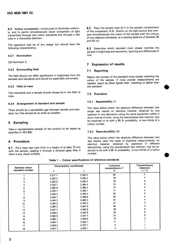 ISO 4630:1981 is a standard published by the International Organization for Standardization (ISO). Its full title is "Binders for paints and varnishes — Estimation of colour of clear liquids by the Gardner colour scale". This standard covers: Binders for paints and varnishes — Estimation of colour of clear liquids by the Gardner colour scale