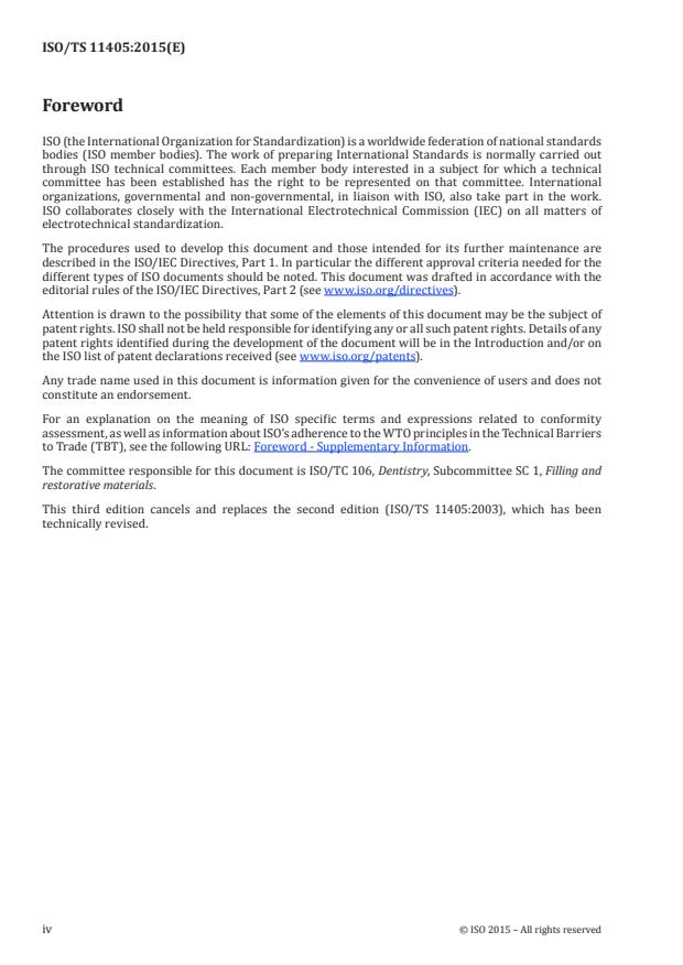 ISO/TS 11405:2015 is a technical specification published by the International Organization for Standardization (ISO). Its full title is "Dentistry — Testing of adhesion to tooth structure". This standard covers: ISO/TS 11405:2015 gives guidance on substrate selection, storage, and handling as well as essential characteristics of different test methods for quality testing of the adhesive bond between restorative dental materials and tooth structure, i.e. enamel and dentine. It includes a tensile bond strength measurement test, a test for measurement of marginal gaps around fillings, a microleakage test, and gives guidance on clinical usage tests for such materials. Some specific test methods for bond strength measurements are given for information in Annex A. ISO/TS 11405:2015 does not include requirements for adhesive materials and their performance.