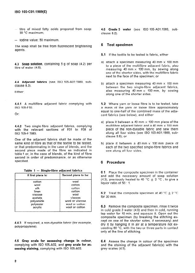 This part of ISO 105 specifies Test No. 1 of a series of five washing tests. A specimen of the textile, in contact with one or two specified adjacent fabrics, is mechanically agitated under described conditions of time and temperature in a soap solution, then rinsed and dried. The change in colour of the specimen and the staining of the adjacent fabric(s) are assessed with the grey scales.