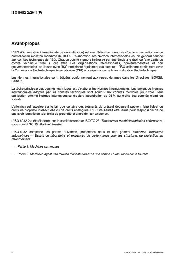 Ta del standarda ISO 8082 vzpostavlja skladen, ponovljiv način za zaščitne strukture proti prevrnitvi na gozdarskih strojih z lastnim pogonom pod statično obremenitvijo in določa zahtevane lastnosti za reprezentativnega preskušanca pod tako obremenitvijo. Velja za stroje, ki so konfigurirani kot gozdarski stroji ali opredeljeni kot taki v standardu ISO 6814, z vrtljivo ploščadjo s kabino – s fiksno napravo za dvig kabine ali brez nje – in jamborjem na isti ali ločeni ploščadi, ki naj bi jo upravljal upravljavec, pripet z varnostnim pasom. Ne velja za gozdarske stroje s kabino, ki se lahko dvigne.