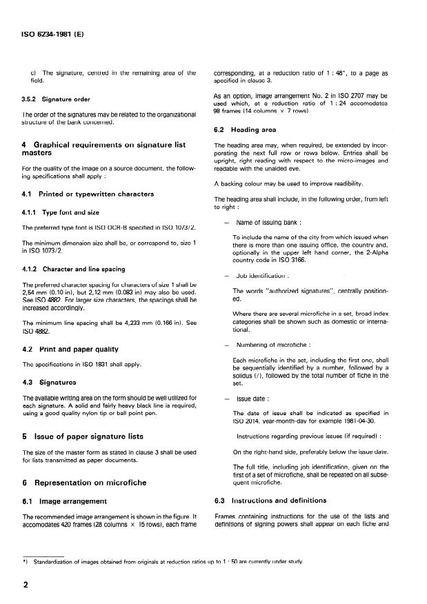 ISO 6234:1981 is a standard published by the International Organization for Standardization (ISO). Its full title is "Bank operations — Authorized signature lists and their representation on microfiche". This standard covers: Specification of size, layout and content of the master form, including graphical requirements, for autorized signatrue lists used as source documents by banks. It refers to signature lists transmitted as paper documents, and also specifies their representation on microfiche.