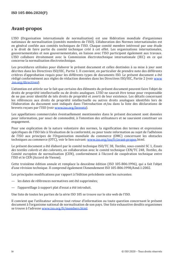Le présent document spécifie une méthode pour déterminer la solidité des coloris et les propriétés de vieillissement de tous les types et formes de textiles teints et imprimés et/ou autres supports organiques sous l'action d'une source de lumière artificielle représentative de la lumière naturelle du jour (D65) et sous l'action simultanée de la chaleur. Parmi les cinq différentes gammes de conditions d'exposition spécifiées (voir 7.1.1), quatre utilisent D65 et la cinquième, une transmission spectrale de longueur d'onde un peu inférieure. La méthode d'essai tient particulièrement compte des conditions d'éclairage et de chaleur de l'intérieur d'un véhicule à moteur. Les cinq différentes gammes de conditions peuvent produire différents résultats d'essai à l'aide des différents dispositifs de filtration optique spécifiés. Les résultats obtenus pour des essais réalisés à l'aide d'appareillages (types d'instruments) différents pour une même gamme de conditions et un même dispositif de filtration optique ne sont pas comparables, car des performances comparables n'ont pas été validées.