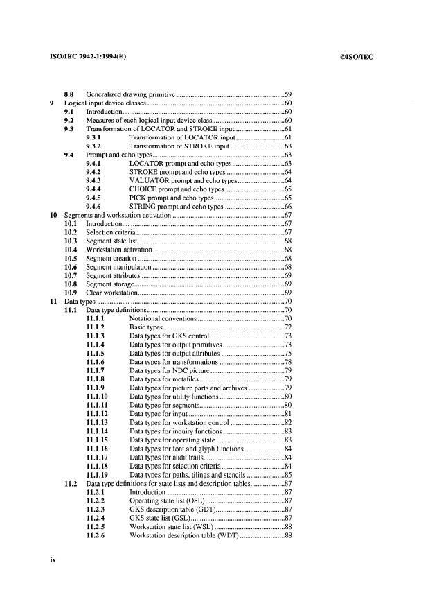 ISO/IEC 7942-1:1994 is a standard published by the International Organization for Standardization (ISO). Its full title is "Information technology - Computer graphics and image processing - Graphical Kernel System (GKS) - Part 1: Functional description". This standard covers: Cancels and replaces the first edition (1985). Specifies a set of functions for computer graphics programming, the graphical kernel system. Provides functions for two dimensional graphical output, the storage and dynamic modification of pictures, and operator input. Applicabe to a wide range of applications that produce two dimensional pictures on vector or raster graphical devices in monochrome or colour.
