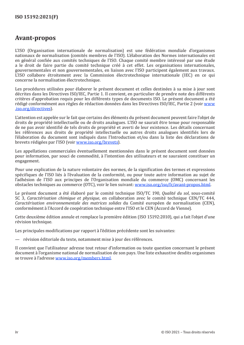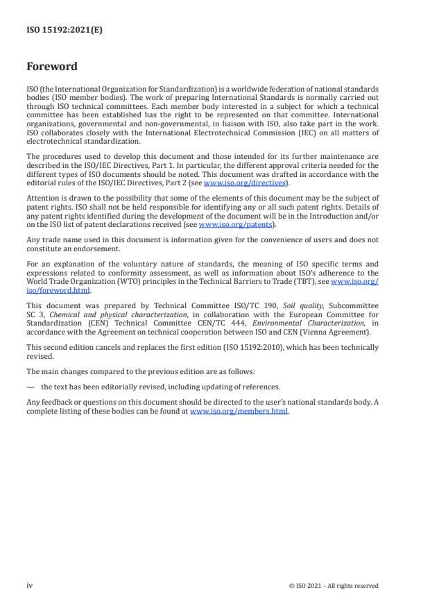 ISO 15192:2021 is a standard published by the International Organization for Standardization (ISO). Its full title is "Soil and waste — Determination of Chromium(VI) in solid material by alkaline digestion and ion chromatography with spectrophotometric detection". This standard covers: This document specifies the determination of Cr(VI) in solid waste material and soil by alkaline digestion and ion chromatography with spectrophotometric detection. This method can be used to determine Cr(VI)-mass fractions in solids higher than 0,1 mg/kg. NOTE In case of reducing or oxidising waste matrix no valid Cr(VI) content can be reported.