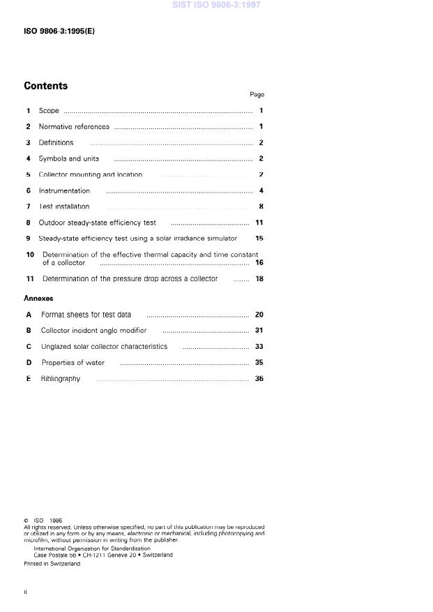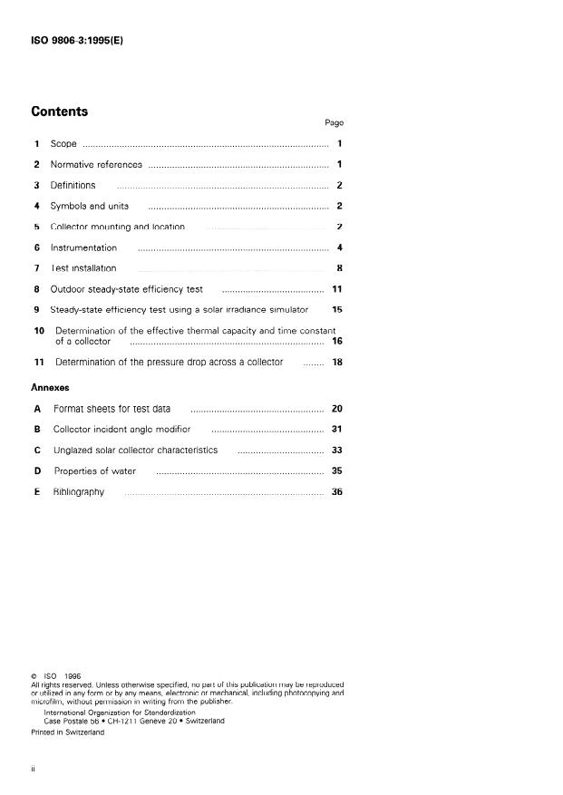 ISO 9806-3:1995 is a standard published by the International Organization for Standardization (ISO). Its full title is "Test methods for solar collectors — Part 3: Thermal performance of unglazed liquid heating collectors (sensible heat transfer only) including pressure drop". This standard covers: Establishes methods for determining the thermal performance of unglazed liquid heating solar collectors. Contains methods for conducting tests outdoors under natural solar irradiation and simulated wind and for conducting tests indoors under simulated solar irradiation and wind. Not applicable to those collectors in which the heat transfer fluid can change phase.