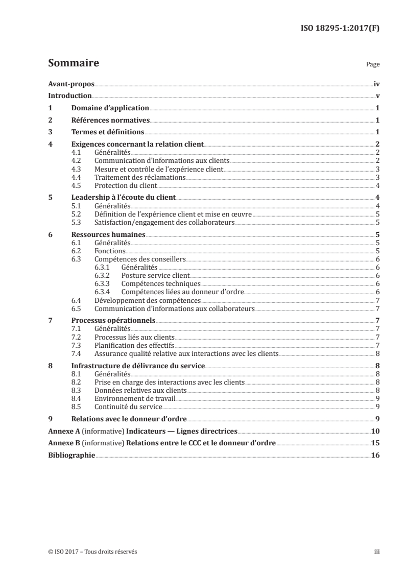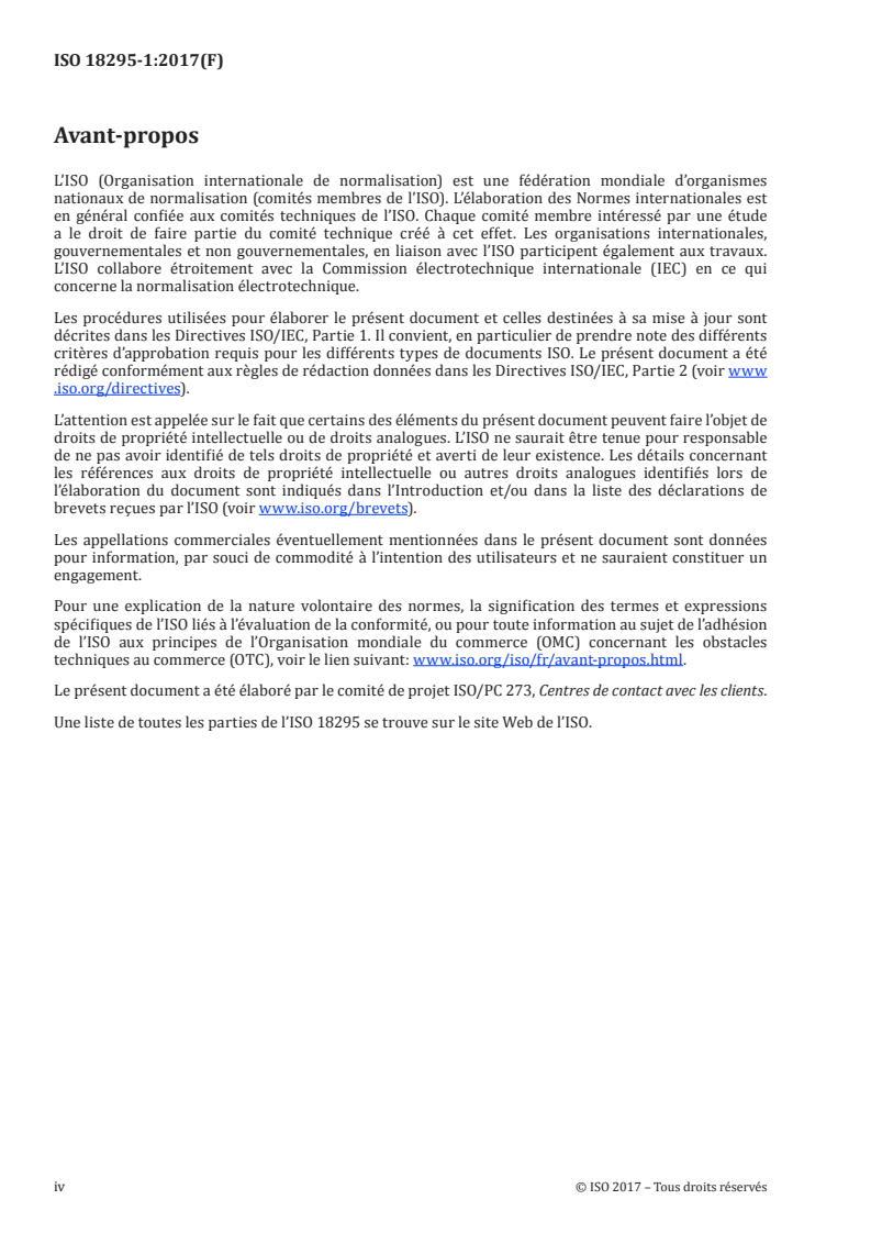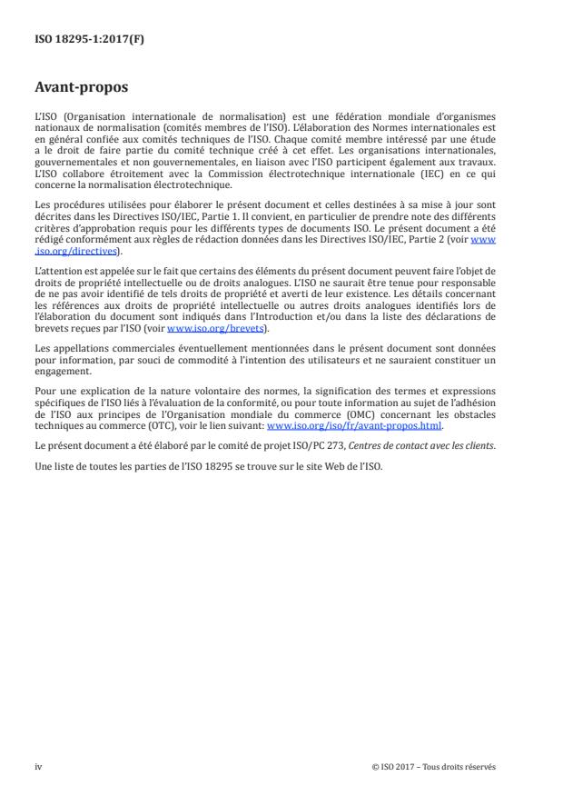 ISO 18295-1:2017 spécifie des exigences de service pour les centres de contact clients (CCC). Il définit un cadre qui a pour objectif d'aider les CCC à délivrer aux donneurs d'ordre et aux clients des services qui, en permanence, répondent à leurs attentes, ou les devancent et même les dépassent. ISO 18295-1:2017 s'applique tant aux CCC internes qu'externalisés (prestataire), de toutes dimensions, dans tous les secteurs et pour tous les canaux d'interaction, y compris entrants et sortants. Il spécifie, quand cela est nécessaire, des indicateurs de performance (IP).