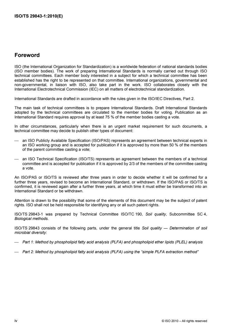 ISO/TS 29843-1:2010 is a technical specification published by the International Organization for Standardization (ISO). Its full title is "Soil quality - Determination of soil microbial diversity - Part 1: Method by phospholipid fatty acid analysis (PLFA) and phospholipid ether lipids (PLEL) analysis". This standard covers: ISO/TS 29843‑1:2010 specifies an extended method for the extraction and determination of both phospholipid fatty acids (PLFA) and phospholipid ether lipids (PLEL) from soils. ISO/TS 29843‑2 specifies a simple method for the extraction of only PLFA from soils.