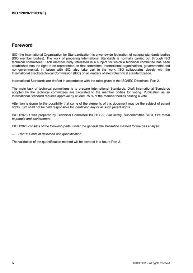 ISO 12828-1:2011 is a standard published by the International Organization for Standardization (ISO). Its full title is "Validation method for fire gas analysis - Part 1: Limits of detection and quantification". This standard covers: In ISO 12828-1:2007, limits of detection and limits of quantification are defined and calculated. It provides methods for determining suitable values for these two parameters for a specific analytical procedure and for a specific chemical species. It does not provide detailed guidance on methods of sampling and analysis of specific species which might be present in fire effluents. This guidance is contained in ISO 19701 and ISO 19702.