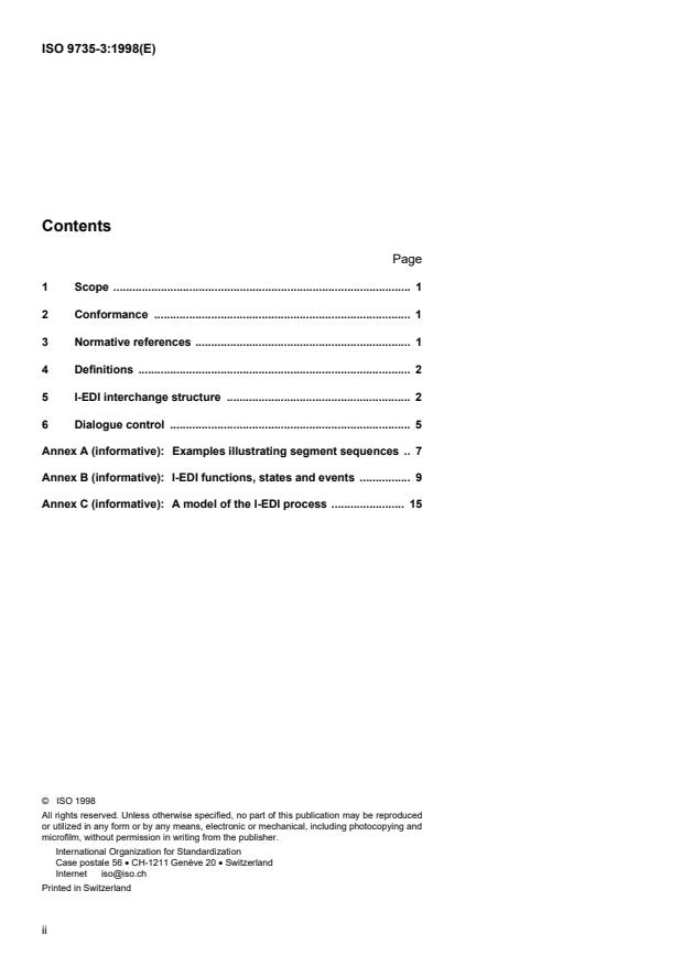 ISO 9735-3:1998 is a standard published by the International Organization for Standardization (ISO). Its full title is "Electronic data interchange for administration, commerce and transport (EDIFACT) — Application level syntax rules (Syntax version number: 4) — Part 3: Syntax rules specific to interactive EDI". This standard covers: Electronic data interchange for administration, commerce and transport (EDIFACT) — Application level syntax rules (Syntax version number: 4) — Part 3: Syntax rules specific to interactive EDI