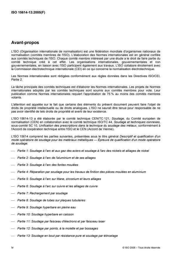L'ISO 15614-13:2005 spécifie les épreuves pouvant être utilisées pour qualifier un descriptif de mode opératoire de soudage. Elle s'applique au soudage en bout par résistance pure et au soudage par étincelage des matériaux métalliques, par exemple des sections droites pleines ou tubulaires, plates ou circulaires. Les principes de base de l'ISO 15614-13:2005 peuvent être appliqués à d'autres procédés de soudage par résistance lorsque la spécification le spécifie. L'ISO 15614-13:2005 définit les conditions d'exécution des épreuves de qualification et les limites de validité d'un mode opératoire qualifié, pour toutes les opérations pratiques de soudage concernées par l'ISO 15614-13:2005. L'ISO 15614-13:2005 traite des procédés de soudage par résistance suivants, tels que définis dans l'ISO 4063: 24 soudage par étincelage en courant continu ou en courant alternatif avec diverses séquences de mouvement, étincelage continu et étincelage intermittent; 25 soudage en bout par résistance pure, en courant continu ou en courant alternatif avec diverses séquences d'effort.