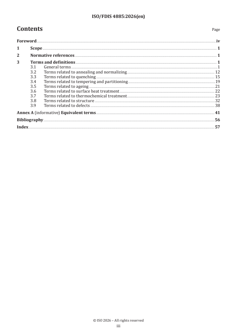 ISO/FDIS 4885 is a draft published by the International Organization for Standardization (ISO). Its full title is "Ferrous materials — Heat treatments — Vocabulary". This standard covers: ISO 4885:2018 defines important terms used in the heat treatment of ferrous materials. NOTE The term ferrous materials include products and workpieces of steel and cast iron. Annex A provides an alphabetical list of terms defined in this document, as well as their equivalents in French, German, Chinese and Japanese. Table 1 shows the various iron-carbon (Fe-C) phases.